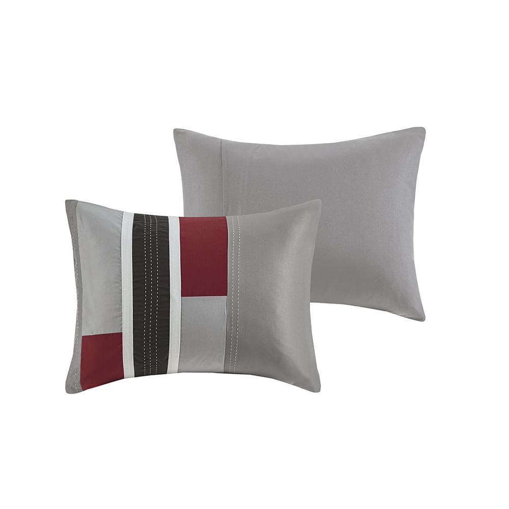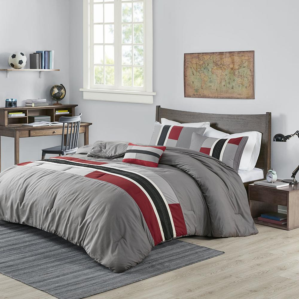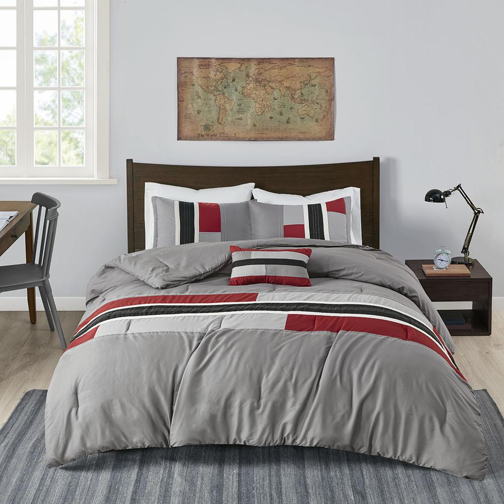 The Mi Zone Pipeline Comforter Set offers a fresh update to your room. The ultra-soft microfiber comforter boasts a striped pieced design in bold colors, for a casual look with an urban feel. Top stitching and twill tape details highlight the design, creating an eye-catching contrast. Coordinating shams (1 in Twin/TwinXL) reiterate the comforter's design, while two decorative pillows use embroidered details and fabric manipulation to complete the slick ensemble. Machine washable for easy care, this comforter set provides a fun and stylish update to your bedroom. This bedding set also uses an antimicrobial treatment that provides built-in freshness protection, reducing the growth of odor causing bacteria to keep fabric lasting longer.