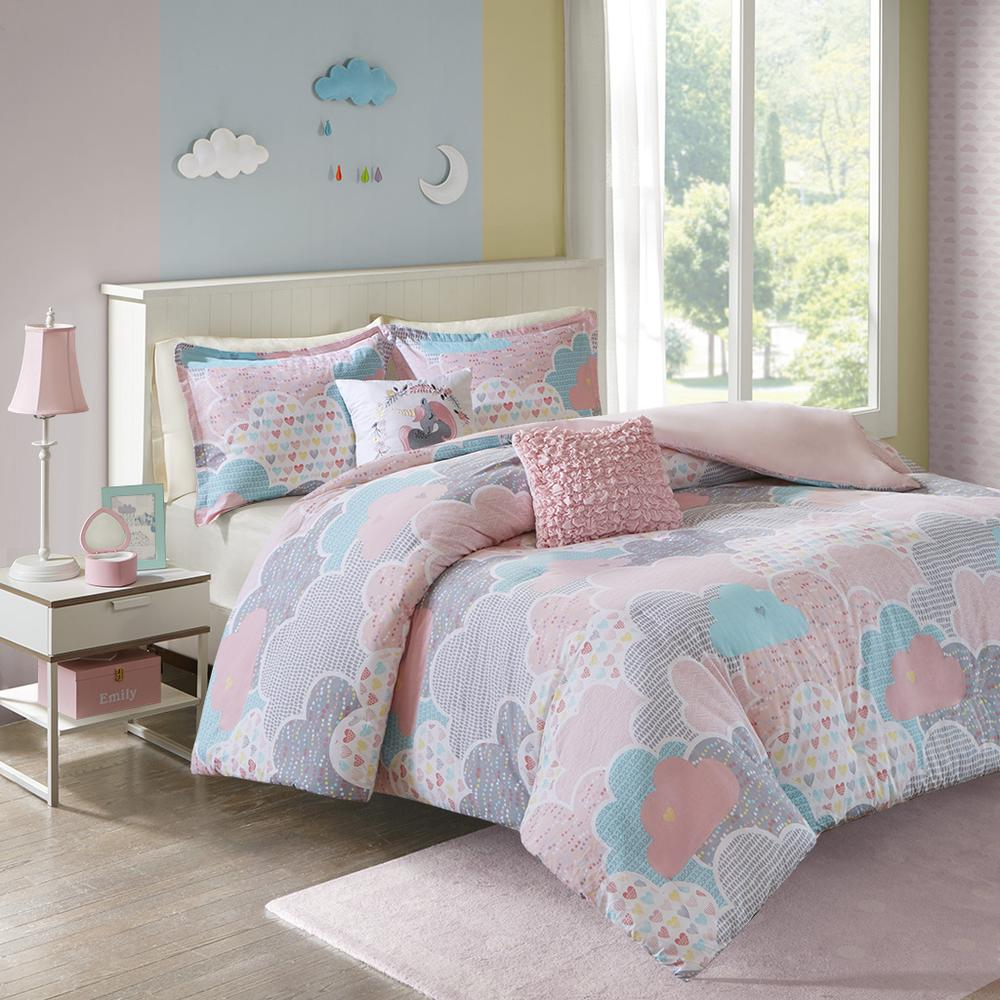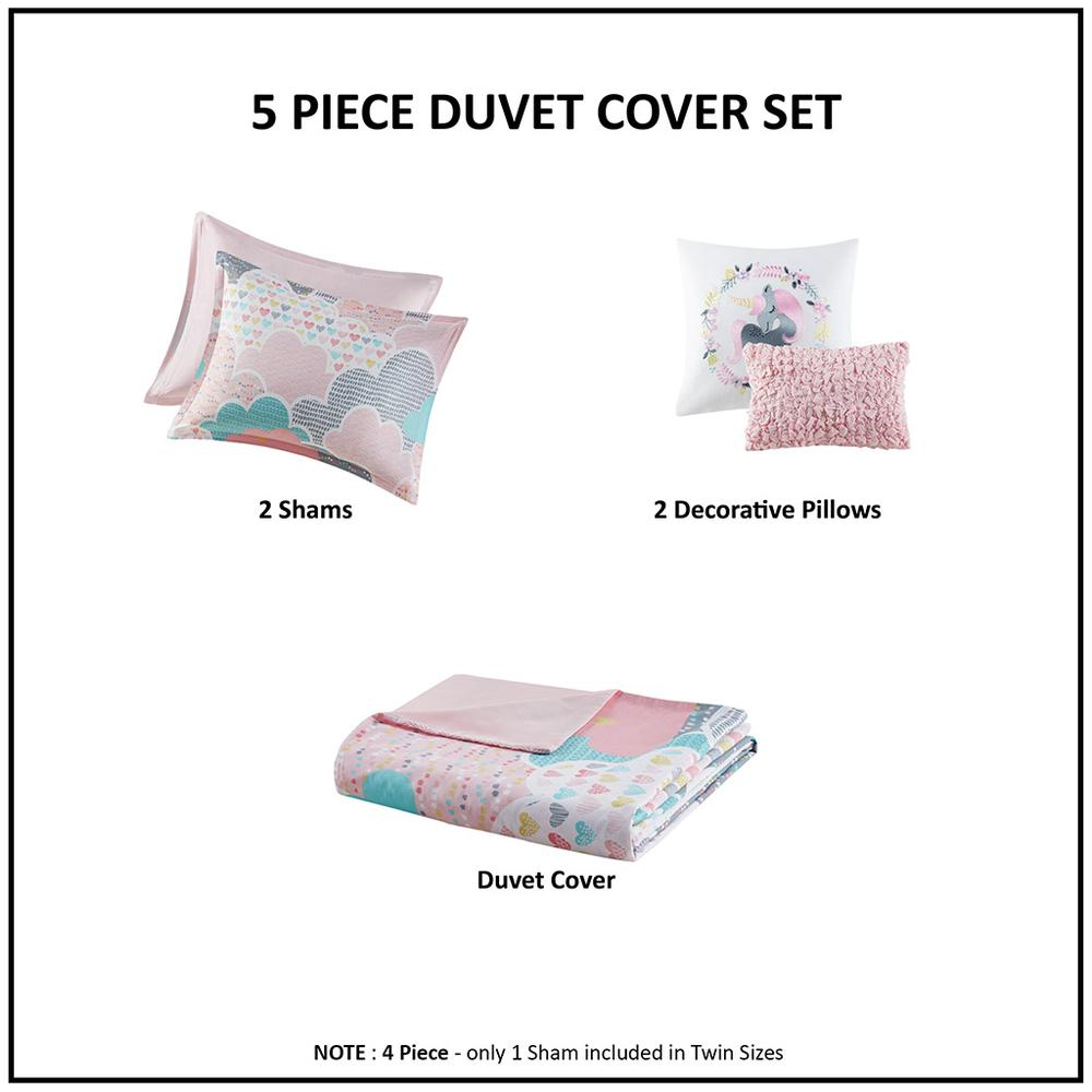 Drift off to dreamland with the whimsical charm of the Urban Habitat Kids Cloud Cotton Printed Duvet Cover Set. The duvet cover and shams (1 in Twin Sizes) showcase a cute and fluffy cloud motif in a soft colorful palette with a solid reverse. An oblong decorative pillow features all-over ruching and the square pillow features an embroidered unicorn. Made from 100% pre-shrunk cotton, this duvet cover set is hypoallergenic and bed-ready right out of the package. This bedding set is also OEKO-TEX certified, meaning it does not contain any harmful substances or chemicals, and uses an antimicrobial treatment that provides built-in freshness protection, reducing the growth of odor causing bacteria to keep fabric lasting longer. A button closure allows you to place a comforter insert within the duvet cover and internal corner ties help prevent it from shifting (Insert is NOT included).