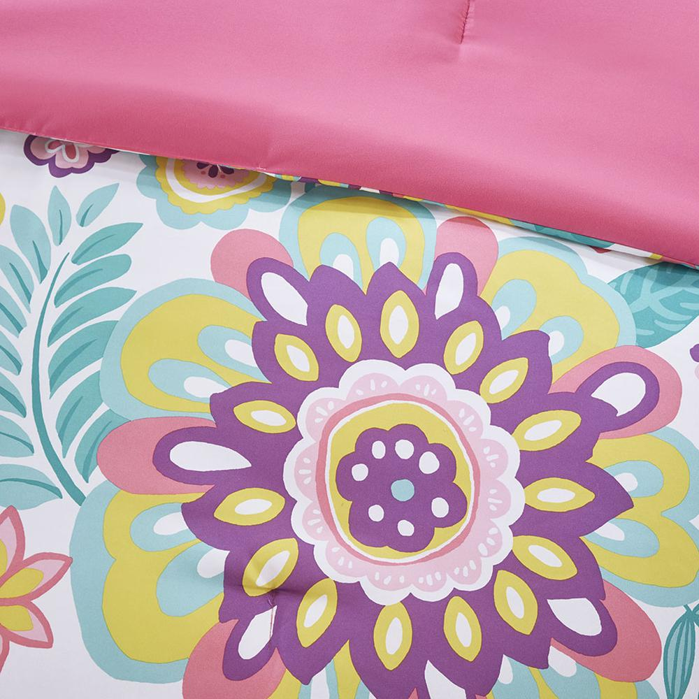 Brighten your bedroom with the fun and colorful style of the Mi Zone Camille Floral Comforter Set. The bright comforter and shams (1 in Twin/TwinXL) features a vibrant medallion flower print with a solid pink reverse, creating an adorable look. A round floral decorative pillow with embroidery complements the comforter set and adds the finishing touch. This bedding set uses an antimicrobial treatment that provides built-in freshness protection, reducing the growth of odor causing bacteria to keep fabric lasting longer.